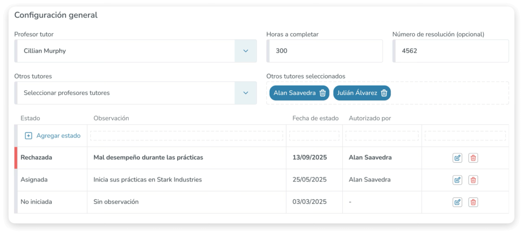 Administra el avance de cada estudiante según su situación real en el proceso de práctica.