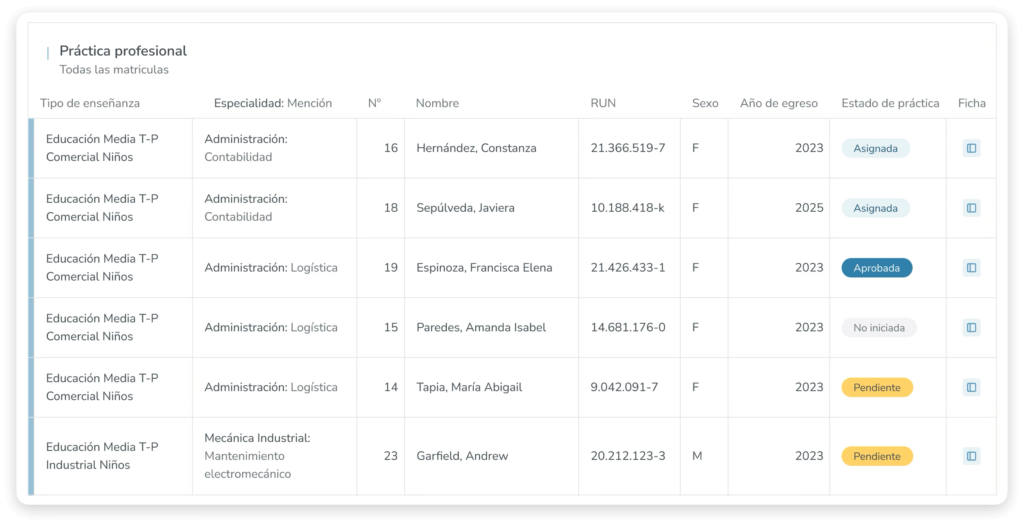 Los estados te permiten visualizar fácilmente quiénes aún no inician, quiénes están asignados, y quiénes ya completaron su práctica.
